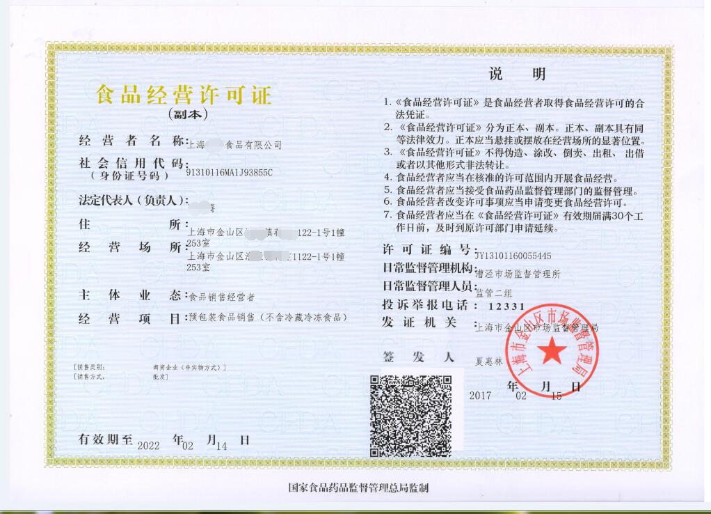 第四步:我方準(zhǔn)備辦理食品經(jīng)營許可證材料(包括注冊地址、倉庫、設(shè)備等),您簽好后,我們遞交食 品藥品監(jiān)督管理局。30天出食品經(jīng)營許可證。